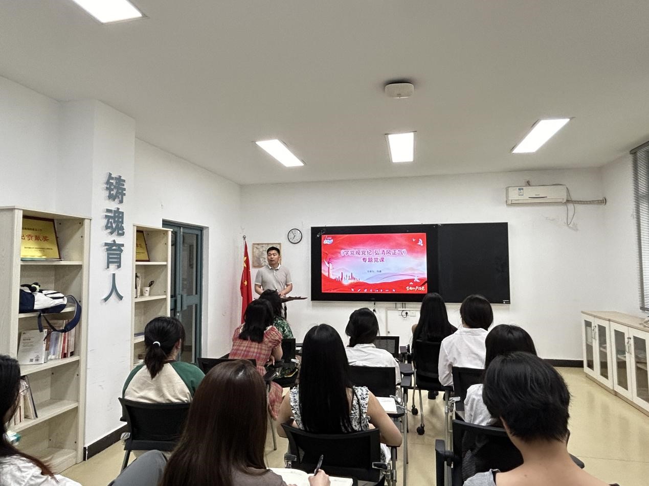 冯鑫为支部党员讲授《学党规党纪,弘清风正气》专题党课,向学生党员讲述了本次《条例》修订的主要内容、党风廉政建设的重要性以及如何抓好党风廉政建设。他指出党风廉政建设直接影响着党的执政基础以及执政效能,要加强党风党纪学习教育,夯实党员勤政廉洁的思想基础,扎实推进腐败风险预警防控工作,全体党员要把学习贯彻《条例》作为重要政治任务,以严明的纪律推进党的自我革命,不断提升党员的政治素养和拒腐防变能力,切实做到学记、知纪、明纪、守纪,做到言行一致、表里如一。