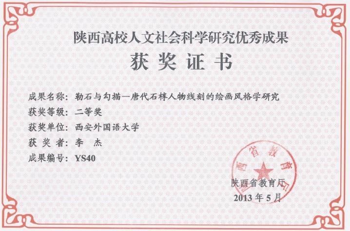 教师李杰的专著《勒石与勾描-唐代石椁人物线刻的绘画风格学研究》,2002年10月由人民美术出版社出版发行。今年5月,专著《勒石与勾描》荣获“2013年度陕西高校人文社会科学研究优秀成果奖”二等奖。