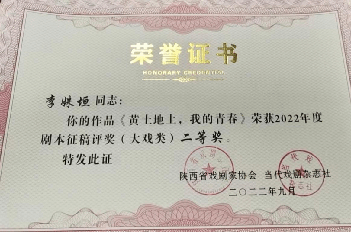 2018级研究生李姝垣的剧作在陕西省戏剧家协会、当代戏剧杂志社联合主办的2022年剧本征稿活动中,获得大戏类作品二等奖。