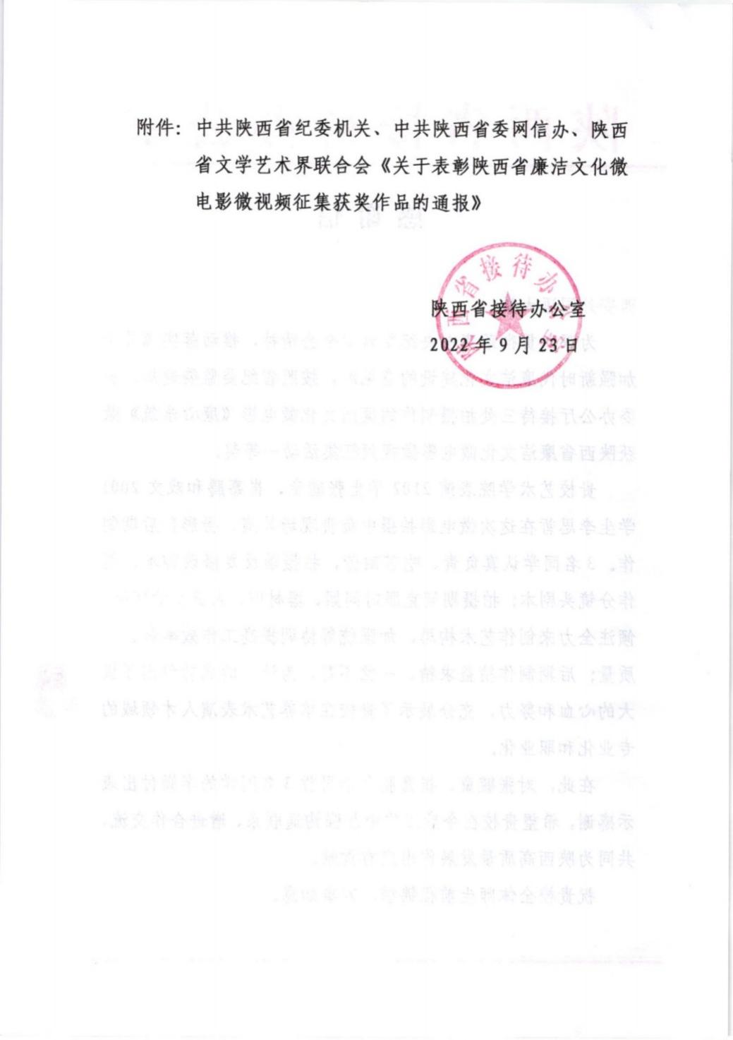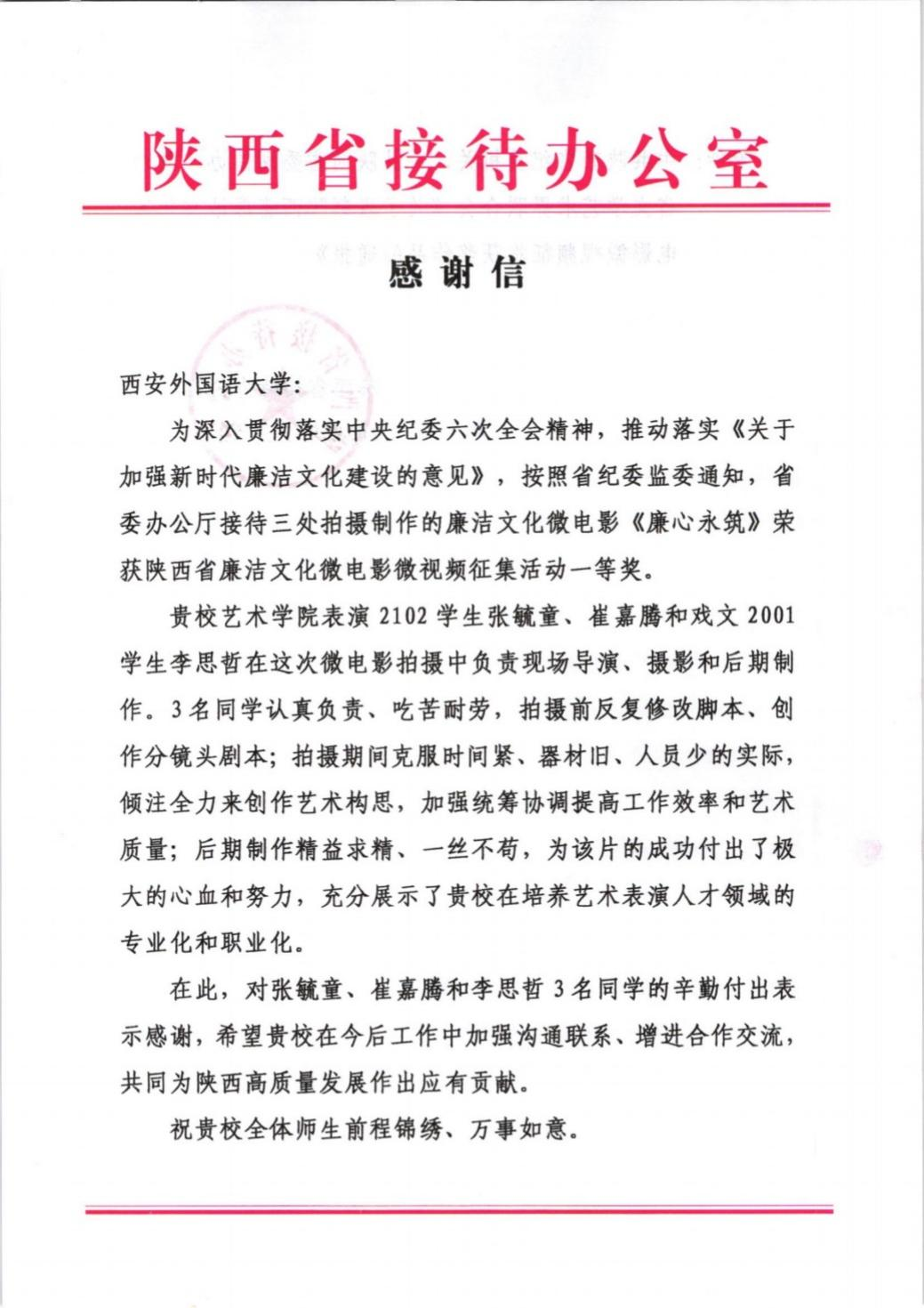 表演专业2101班学生张毓童、崔嘉腾和戏文专业2001班学生李思哲配合陕西省委办公厅拍摄制作的廉洁文化微电影《廉心永筑》,从180余部候选作品中脱颖而出,喜获征集活动一等奖,受到陕西省委办公厅通报表扬。省委办公厅接待办公室向我校发来《感谢信》,对我校在艺术人才培养、对外协作等方面成绩表示肯定,对3名同学认真负责、吃苦耐劳完成微电影制作表示感谢。