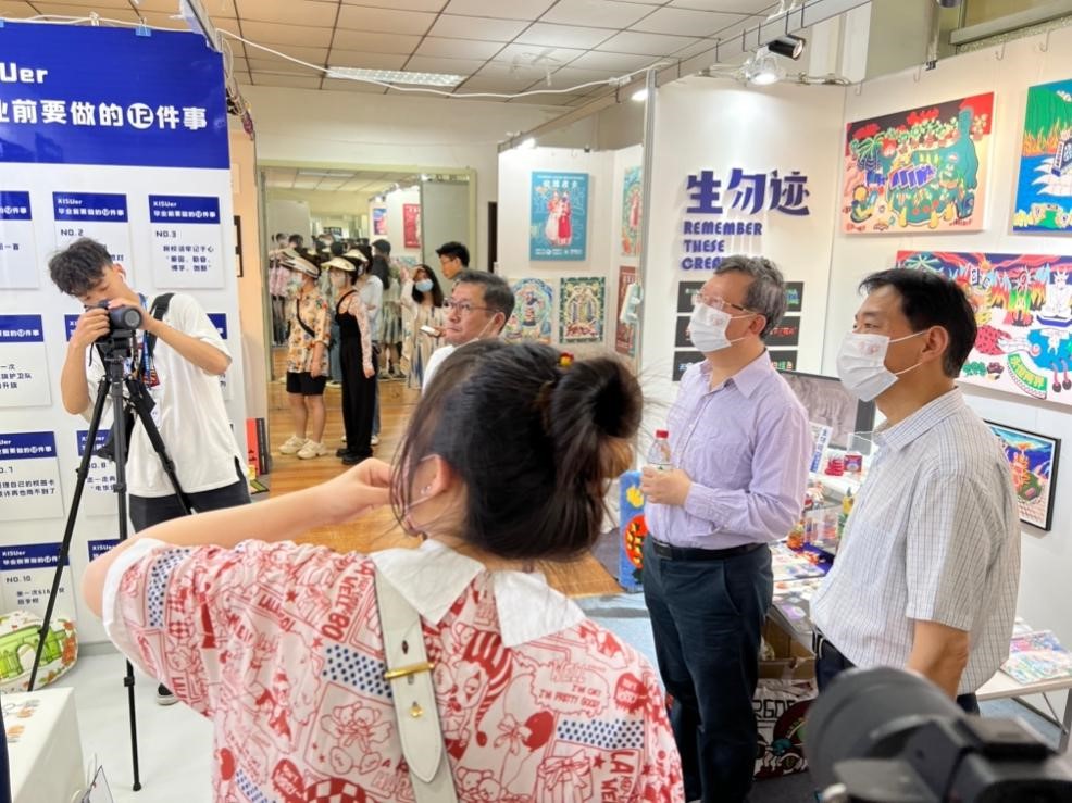 最后,王启龙宣布“庆祝建校70周年暨2022届毕业作品展”开幕。参观过程中,王启龙与现场师生进行了亲切的交流,询问同学们的创作思路和创作中的收获。王启龙指出,此次毕业创作展展现了学生们的创作激情和丰硕成果,他勉励大家,在以后的艺术创作道路上,要不断创作出让人民喜欢的反映时代精神的好作品。