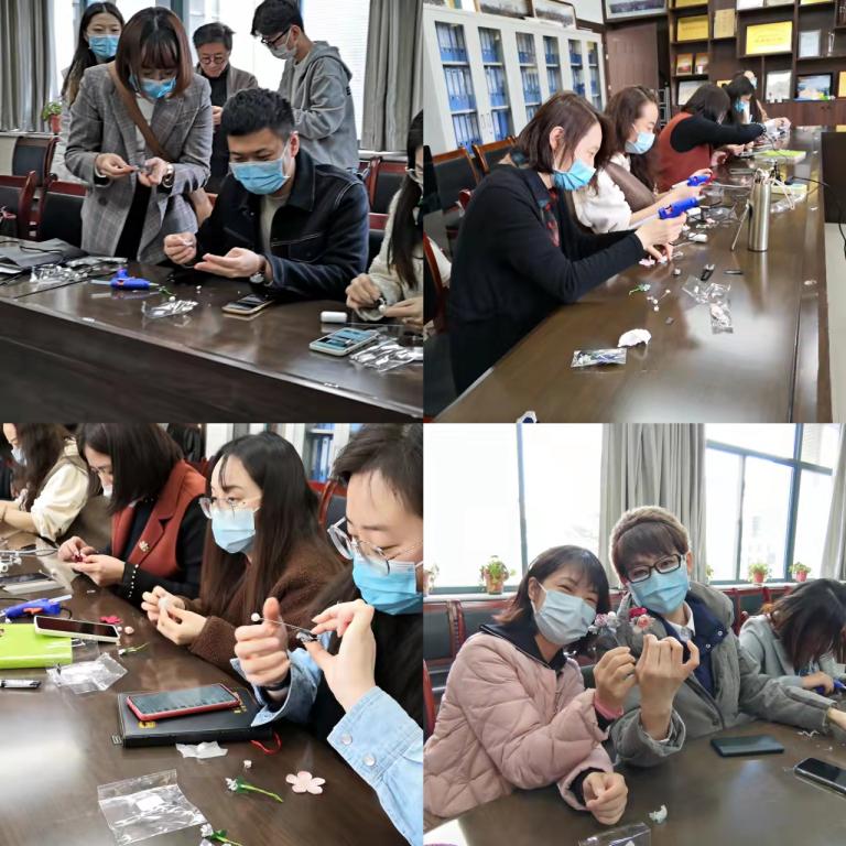 随后,全体女教师集体制作了花饰胸针,老师们一显身手,在制作过程中相互交流,分享经验,现场气氛融洽、其乐融融,经过半个小时的制作,一个个漂亮又独具个人风格的胸花就制作完成了,大家相互展示着自己的作品,期间欢声笑语不断。