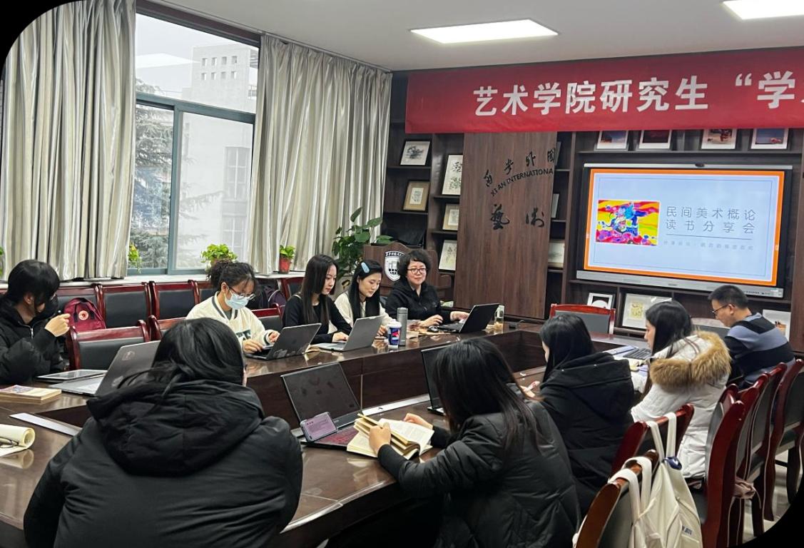 研究生阶段应该掌握的读书方法,并对民间美术的经典读本进行概括分析,随后学生们一一分享自己的对于经典读本的读书思考,并就当代民间美术的学习、传承发展以及设计应用为论题展开讨论。此次读书会侯老师还邀请了学院戏文专业的焦冰岩老师作为嘉宾,两位老师以她们丰厚的学养和经验与学生们分享自己的读书感悟,并对同学们在读书过程中存在的困惑及提出的问题逐一解答,师生互动活跃。活动期间,李杰院长来到现场鼓励所有研究生们多读书读好书,并对部分学生提出的民间美术造型变化的自我思考和解读予以肯定和赞许,他表示今后读书会活动应该形成常态化的模式传扬下去。