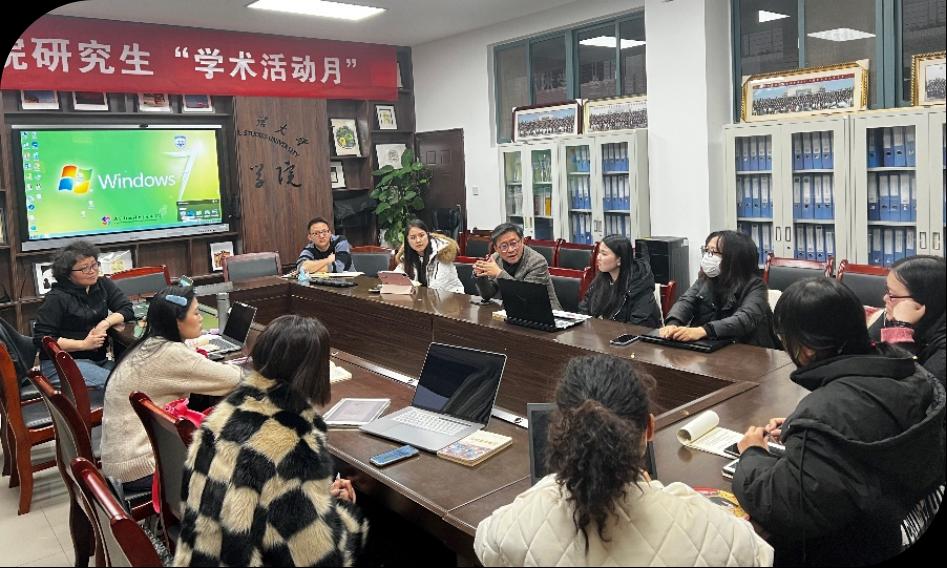 部分教师及全体研究生参加。徐老师从时代背景、行业发展、社会生活等方面阐述了中国早期电影的发展史和女演员在行业中的发展过程,阐明了行业的前景及女性权力发展的不易。同学们从生产劳动方式决定男女的社会地位,时代背景的不同对中国电影行业的影响等多方面问题展开讨论。徐雅宁老师总结女性的发展与社会需求,行业需求的影响息息相关,女性的伟大和魅力是不容小觑等观点。