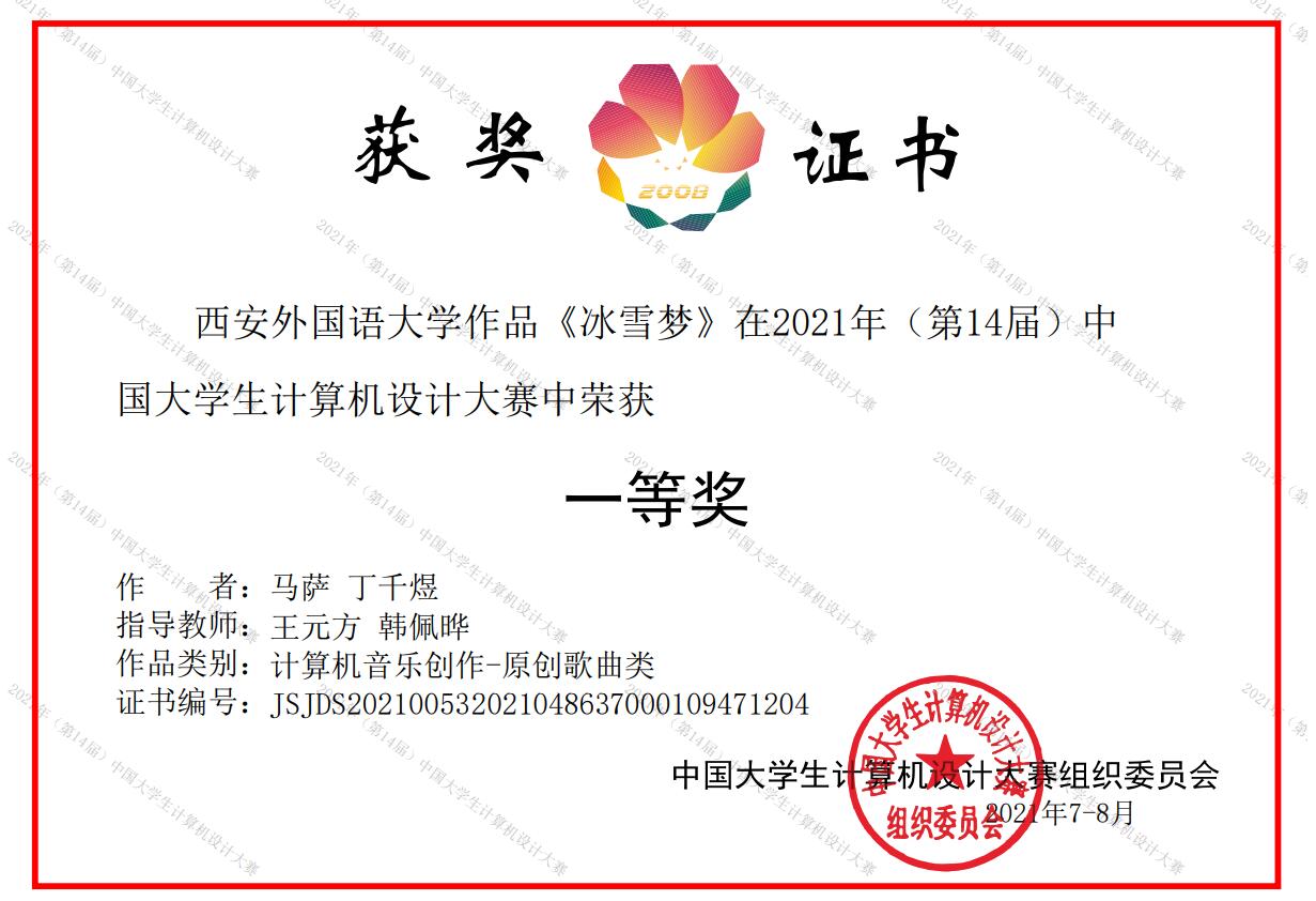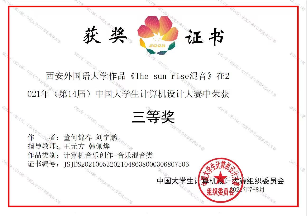 各位领导老师的大力支持,在王元方老师,李金明老师和韩佩晔老师的指导下,我校推荐的3个参赛团队获得中国大学生计算机设计大赛国赛的参赛资格。国赛举办时间在7-8月,三位指导老师利用暑假时间对进入国赛的团队作品进行赛前指导和答辩预演,学校的情景交互式声音设计虚拟仿真实验室为创作提供了技术支持。经过国赛组委会和承办方对进入国赛的作品层层筛选和评审,在最后的决赛答辩中,我校3个团队作品分别获得一项国赛一等奖,两项国赛三等奖。