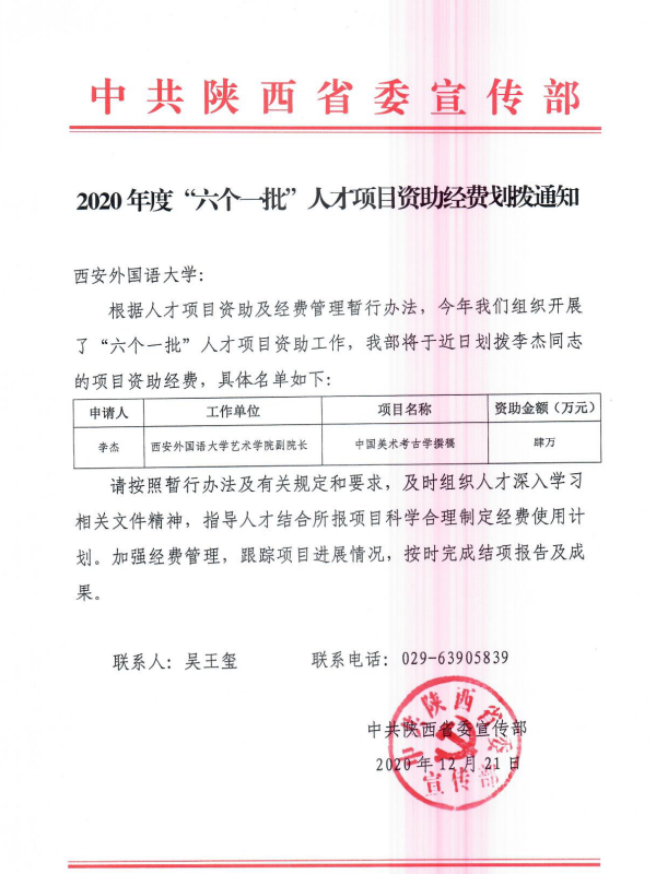 近日,中共陕西省委宣传部公布了2020年度全省宣传思想文化系统“六个一批”人才项目资助立项结果,副院长李杰教授申报的“中国美术考古学撰稿”项目获批立项。