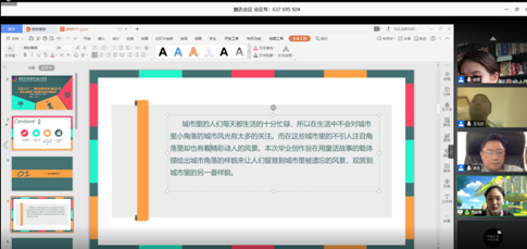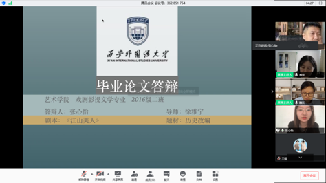 戏剧影视文学和表演专业共四个组,各组在答辩前,学院教学办公室组织答辩委员和答辩学生克服各种困难,按照学院要求做好答辩前线上测试工作,确保答辩当日顺利进行。5月15日,在正式答辩开始前,由学院南华院长和邹满星副院长对答辩环节、答辩要求、答辩纪律等细节问题对所有参加答辩老师开会做了规范和要求。各组答辩在正式开始后,首先由各答辩组长宣读答辩环节和要求,然后每位学生在三分钟内做自我阐述,对于论文(设计)选题,研究方法,结论分析等创作角度进行多方面的讲解和总结,在线共享屏幕通过PPT展示介绍论文(设计)详细内容。在答辩老师提问环节,各组老师们对戏剧影视文学专业学生论文/剧本,表演专业同学的毕业创作报告书进行了逐一点评和提问,并提出了修改意见和建议,学生有序在线回答老师的问题并记录。在问答环节,老师与学生交流顺畅,答辩学生发挥总体比较稳定。