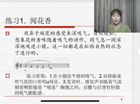 声乐课是表演专业的专业基础课,授课方式以实践内容为主。在以往线下教学中,教师在讲授理论点同时会进行示范演唱,而示范过程中表情、动作,学生是一目了然的。在线上教学中,既能充分的讲述教学内容,又能明确展示教学目标,让学生能够听得懂、又看得明白。我在课前运用EV录屏摄像头嵌入的方式,为声乐课“量身定制”视频微课。这种方式通过PPT演示讲解课程内容中的理论知识点,通过摄像头的嵌入、多屏录制,使学生可以同步看到教师对发声练习、重点难点讲解与范唱过程。辅助学生探究式自学。