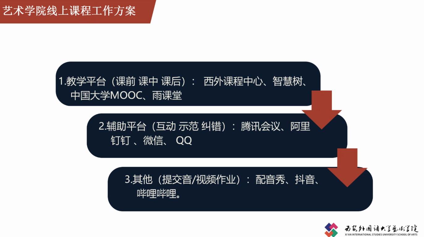 2.多举措、创模式。艺术类课程强实践、重操作,有些课程以手绘示范为主,有些以肢体语言为主,有些以软件操作为主,线上教学难度大。学院教师以“逆行者”的精神为引领,积极参加学校组织的各类教学培训,学习和掌握各种线上教学平台的使用方法,同时运用多平台、多方案,充分调动学生居家学习的现有资源,创新教学方式,打“组合拳”,“自创拳”,多种教学方式的综合运用,保证了教学运行的畅通。