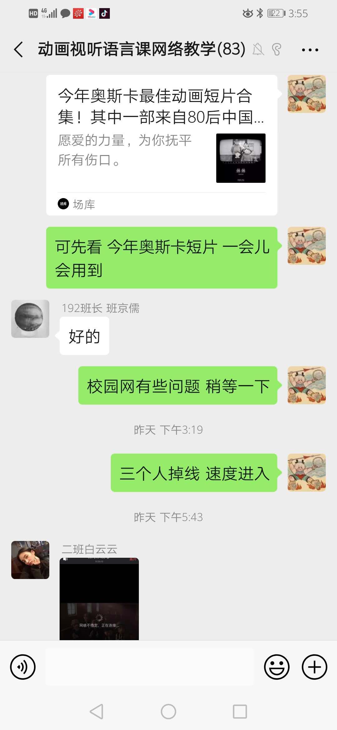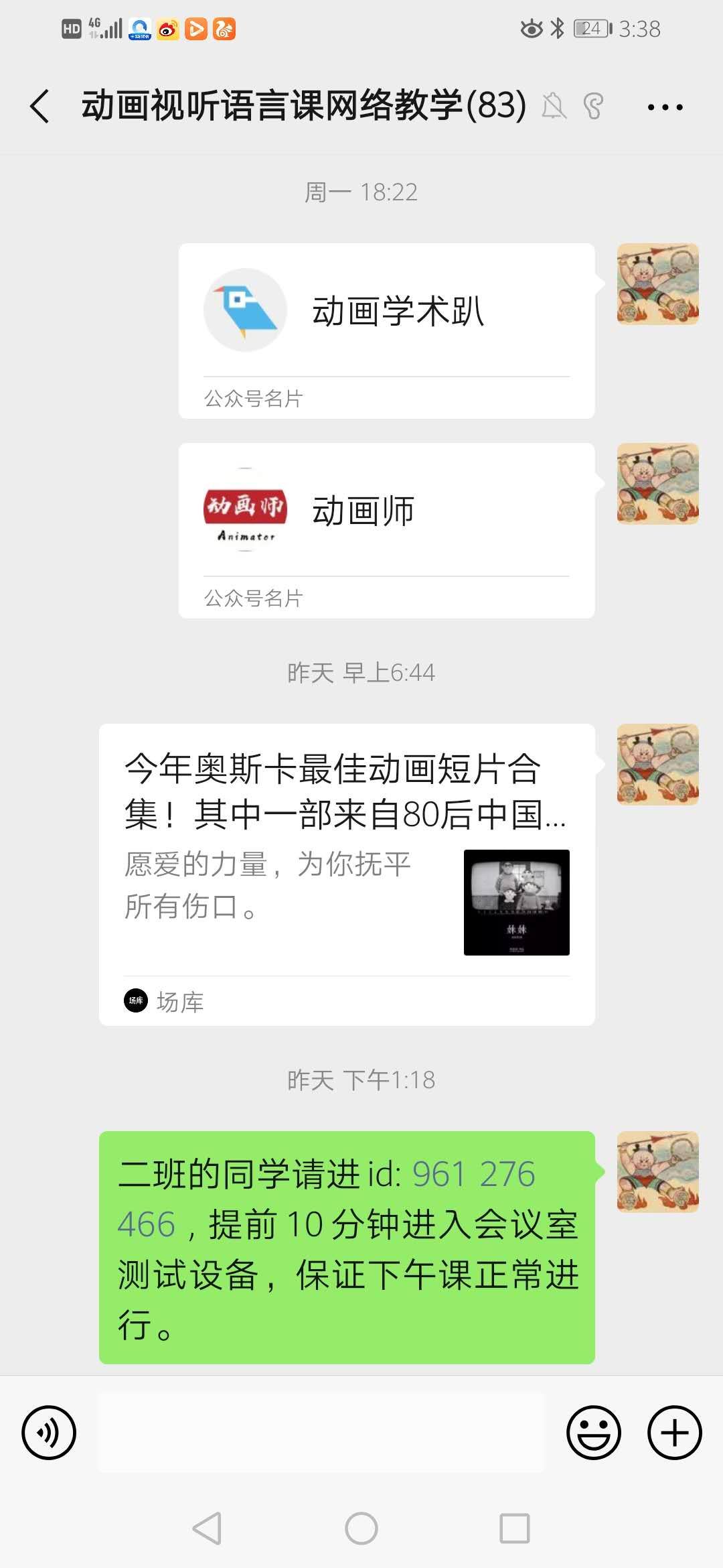 公布腾讯会议的会议号,学生进入。腾讯会议有在线人数的显示,统计到课率。共享桌面,学生端可以看到老师的桌面、操作PPT课件、播放视频、操作动画软件等。学生提问或者回答问题时,可以开麦,老师实时辅导、点评作业等。各门课程互动效果很好。米娜敏老师的二维短片创作课程,采用的是桌面共享的方法来展开教学,学生端与老师实时交流同时操作,如遇问题学生可以直接开麦,现场解答。李金明老师的动画视听语言课,讲到视觉暂留、赛璐璐片等专业识难点时,采用直播现场实物教学展示,讲解知识难点,通过“现场展示+案例视频”结合的形式,效果很好。姚若琳老师的色彩课程,采用了“抗击疫情”主题创作的形式,结合当下的疫情现状分析相关作品,布置了相关课程作业,结合专业特点及工具的局限性,学生可以采用纸质版、电子版两种形式提交。动画教研室其他老师课程、外聘老师的课程都顺利开展,学生普遍反映很好,出勤率基本全勤,极少数同学因为设备、网络等问题,老师也采用了电话、微信、邮件等形式展开课后的教学。