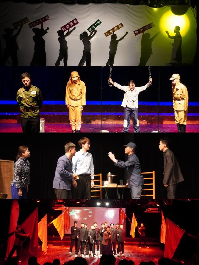 展演现场,光影交替,同学们以《奋起百年路,启航新征程》《红魂》《红色的花儿》《水到渠成》等四个剧目片段,将中国共产党的百年奋斗史、抗日英雄赵一曼慷慨就义、艺术家田汉领导青年艺术革命运动、海归大学生村官秦玥飞带领村民修渠致富等剧情串联在一起,将一代代青年与党同行、与祖国同行、与人民同行、与时代同行的信念贯穿始终,展现出不同历史时期的中国青年坚定信念、团结奋斗、砥砺前行、担当作为的昂扬风采。活动以共产党人精神谱系为丰富育人资源,将党的历史、青年故事与舞台演绎融为一体,使台下观众产生了强烈共鸣,带领大家沉浸式体验了一堂生动的大思政课。
