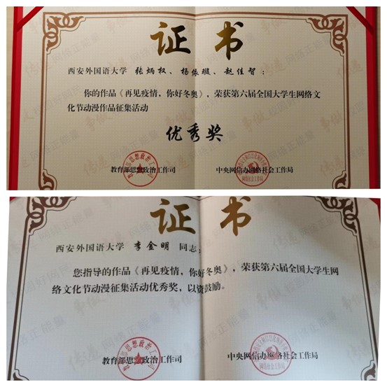 李金明老师指导、2019级学生张炳权、杨依璇和赵佳智三位同学共同制作的动画作品《再见疫情,你好冬奥!》在本次活动中获得优秀奖。