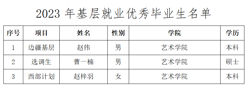 2023年度共有6名毕业生参军入伍报效祖国,入伍人数为全校第一名,获评“2023年征兵工作先进单位”。赵伟、曹一楠、赵梓羽3名学生积极响应党和国家的号召,分别投身边疆基层项目、选调生、西部计划(研究生支教团),主动到艰苦边远地区、基层单位建功立业,用实际行动践行爱国情怀和使命担当,荣获“基层就业优秀毕业生”荣誉称号。