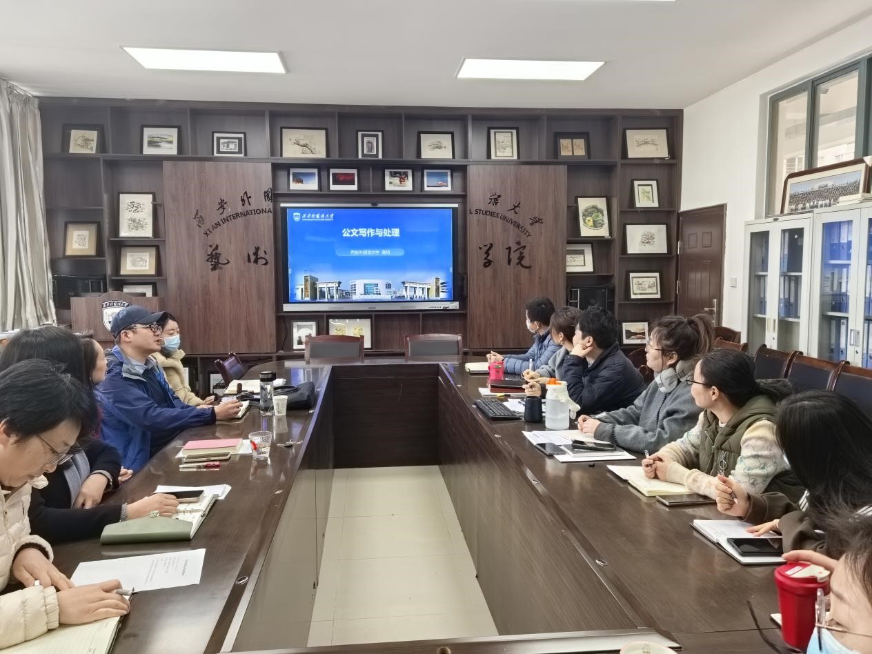 在JE301会议室举办第三期管理干部作风能力提升专题交流培训会,邀请马克思主义学院高明老师来院做专题辅导,本次培训的主题是公文写作与处理。学院党委书记梅林竹、全体行政干部、辅导员参加会议。会议由党委副书记屈晓主持。