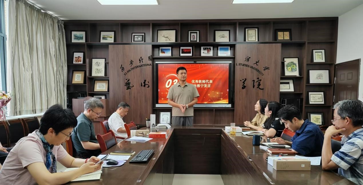 校级优秀教师、戏剧影视文学专业教研室徐雅宁教授作为教师代表发言,他分享了自己从教感悟,从“荣誉感”、“责任感”、“紧迫感”三方面号召大家以教育家精神为指引,不断提高自身本领,潜心教书育人,为学校学院发展贡献自己的力量。