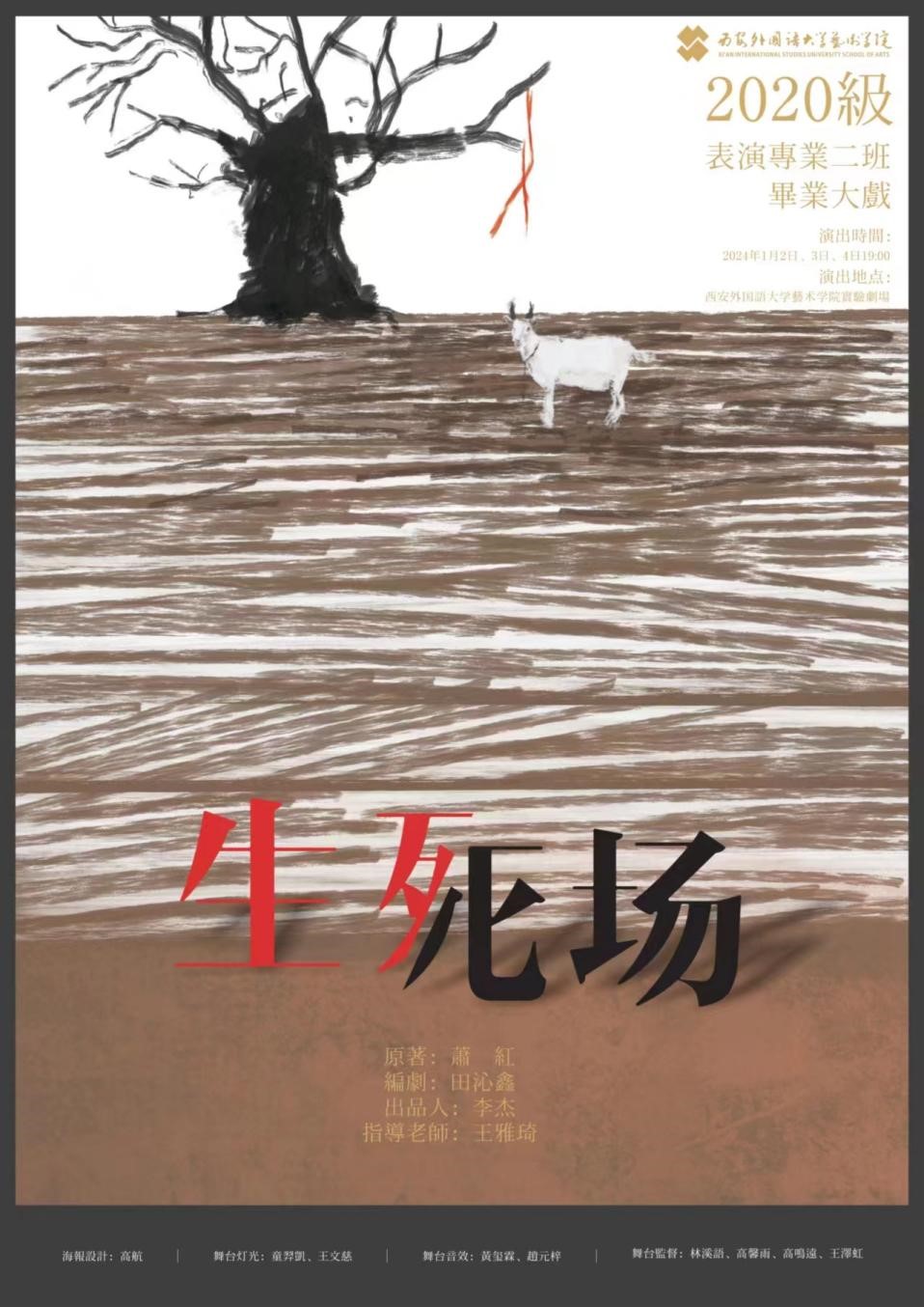 话剧《生死场》改编自萧紅同名中篇小说《生死场》,话剧以哈尔滨近郊某农村为背景,描写“九一八事变”前后,当地村民和他们视为珍宝的土地以及牲口的故事。农民赵三不堪忍受地主二爷的压迫,决意杀死二爷,却不慎错杀了小偷,被抓进大狱。二爷拿钱赎出了赵三,赵三感恩戴德,他的婆子却因此服了毒。农民二里半的儿子成业看上了赵三家的闺女金枝,二里半提亲遭到拒绝。二里半恼怒之时,日本兵进了村,二里半觉得要是“亲善”的兵住进了家,村里人就不敢看不起他,便热情招呼日本兵吃喝。饭饱之后,日本兵强奸并杀死了他的婆子。成业提亲不成,携金枝私奔,不幸被抓走当了兵,在这期间抗日意识觉醒。回村后,成业宣传抗日遭到全村拒绝。为了保护金枝,成业杀了日本兵,惹怒了日军,导致村民遭到无情杀戮。当生命遭受威胁时,村民开始奋起反抗,在抗争中明白了生与死的意义。二里半也告别了他唯一的财产-----一只山羊,加入了抗日队伍。最终,全村人团结起来一起抗日。该剧运用蒙太奇的手法,配合光与影,采用非线性叙事方式,在不同场景间进行切换,阐释生与死的真实含义。反映了在遭受外来侵害时东北农民悲惨的生活状态以及逐渐苏醒的民族意识和反抗精神。