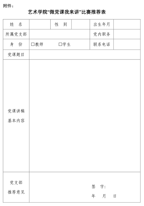 (一)参赛形式。各党支部至少选派2名党员参加学院决赛,其中含1名党支部书记(或支委),1名普通党员。各参赛党员结合授课主题,积极备课,要求原创,严禁抄袭。党支部对微党课主题及内容进行政治把关,于5月29日前将拟推荐微党课推荐表(详见附件)及PPT提交学院党委审核。
