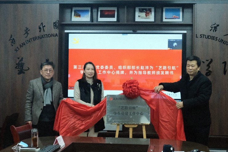 党委在JE301会议室以线上线下相结合的方式举行学习宣传党的二十大精神系列讲座报告暨“艺路引航” 学生党建工作中心揭牌仪式。校党委委员、组织部部长赵沛受邀参加并作专题辅导报告,学院全体教工、部分学生党员代表参加学习。会议由党委书记梅林竹主持。