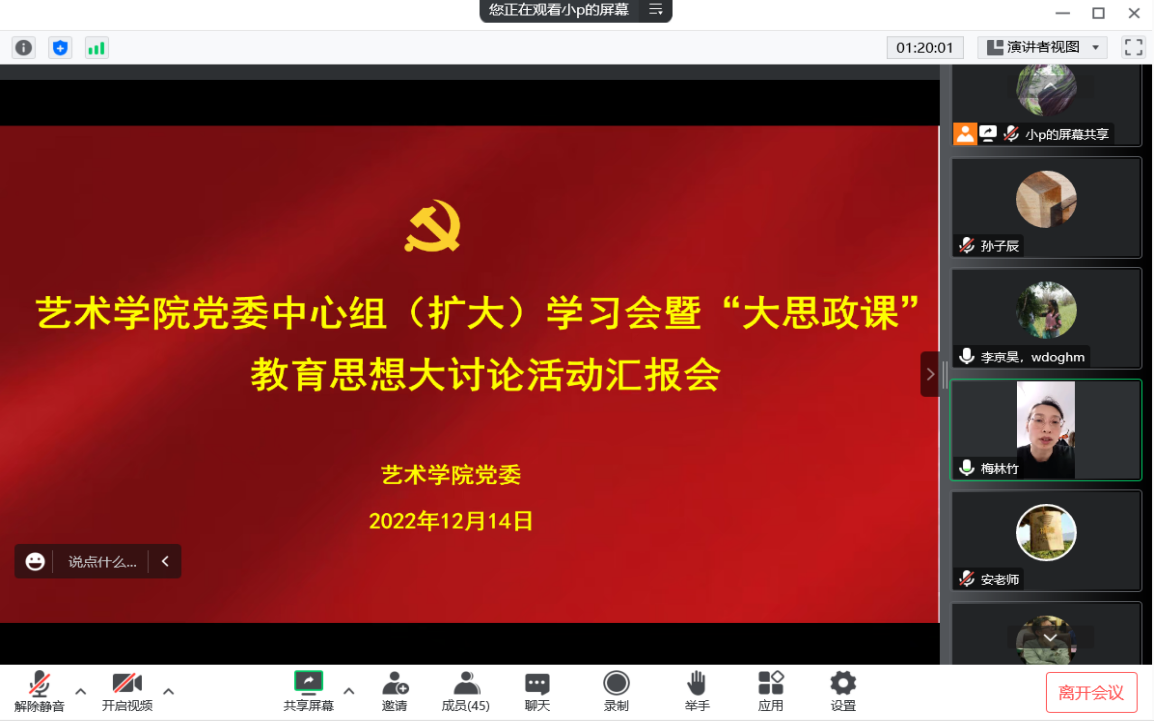 党委在线上召开党委理论学习中心组(扩大)学习会暨“大思政课”教育思想大讨论活动汇报会。校党委委员、副校长李京昊出席会议,学院全体教工参加会议。会议由党委书记梅林竹主持。