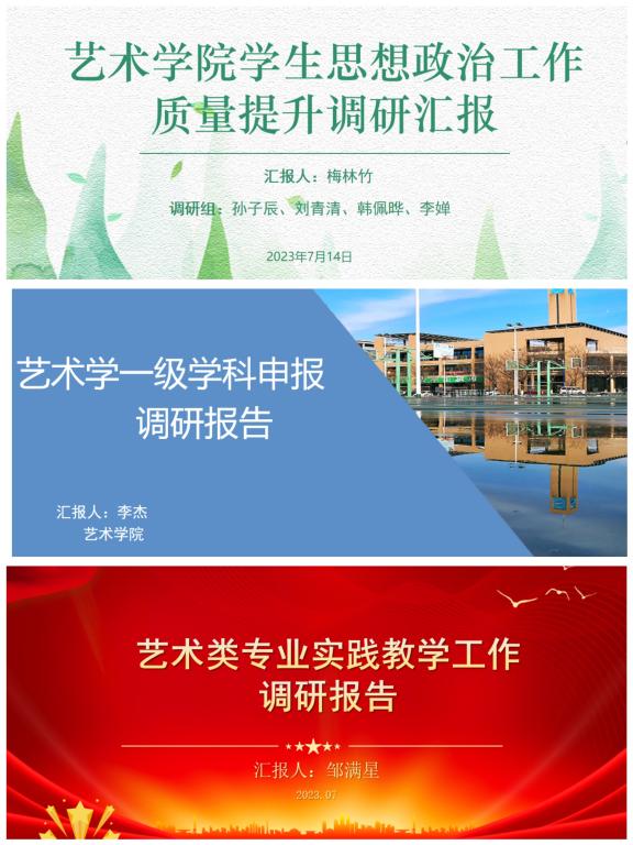 学生思想政治工作质量提升调研》《艺术学一级学科申报调研》《艺术类专业实践教学工作调研》为主题进行了调研成果交流,分析了调研中发现的问题及其原因,提出了解决的方案和建议。