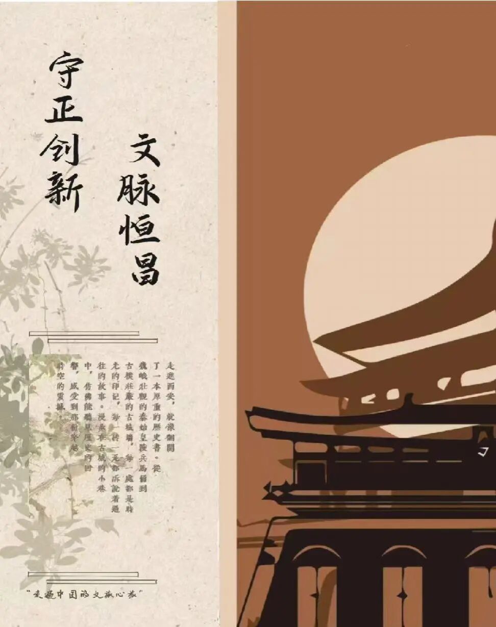 作品以西安文旅为载体,诠释传统文化“守本真、重创新”的传承观,画面融入古城、雁塔等标志性元素,将国风设计理念与现代艺术手法巧妙结合,通过书法字搭配扁平化插画,暖色调柔化历史距离感,国风底纹与钟楼剪影相映成趣,串联起西安众多历史古迹,生动讲述“文脉在传承中焕新、文化在创新中永续”的时代故事,让千年文脉在当代焕发生机。