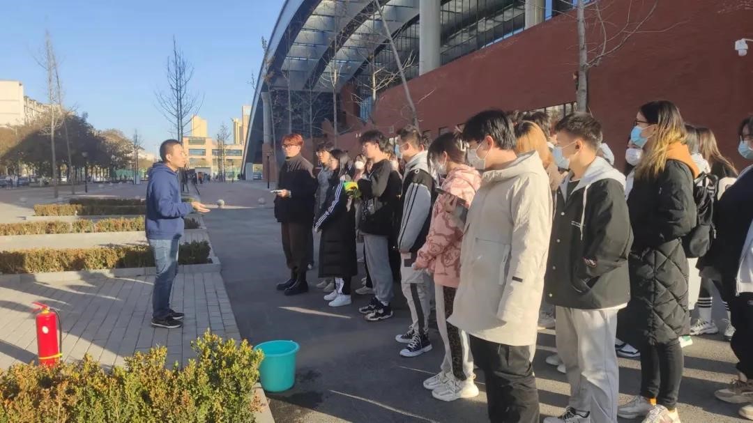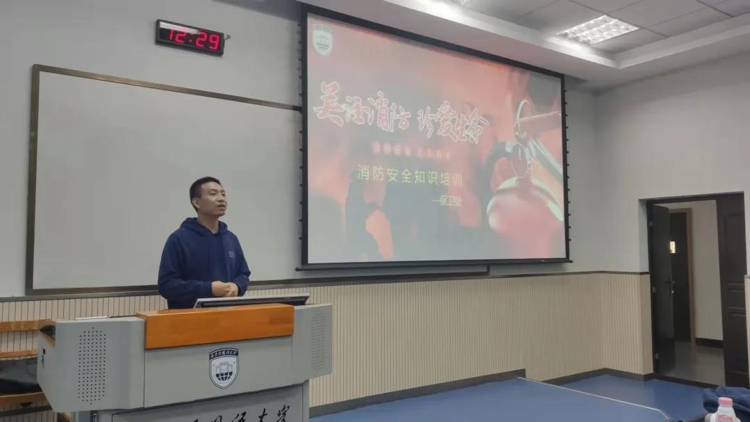 校保卫处赵鹏辉老师就实际案例向学生们讲解校园火灾诱发的原因和校园生活中常见的安全隐患行为,呼吁大家自觉遵守宿舍管理规定,不在宿舍使用违禁电器。之后,赵鹏辉向学生们普及消防器材种类和使用情境及方法,为消防演练环节做铺垫。