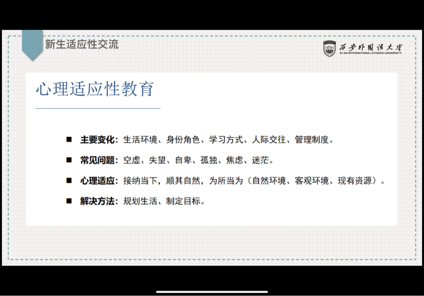 进行了简单介绍,帮助各位新生更快了解学院和专业,快速进入学习状态。还着重强调了学校学院各项规章制度,并对疫情期间的管理政策进行解读。会上,刘青清从心理适应性教育和法制安全教育两个部分与新生进行分享交流,从自身多年工作经验出发,举例子摆事实,帮助新生完成生活适应、人际适应、学习适应和角色适应等。让新生更好地了解大学、认识大学。