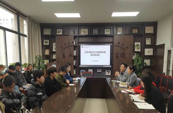 在会议室召开“2021年度春季学期学生返乡座谈会”。学院党委书记梅林竹、学工办主任程成、辅导员及研究生、本科生部分学生代表参加座谈。会议由学工办主任程成主持。
