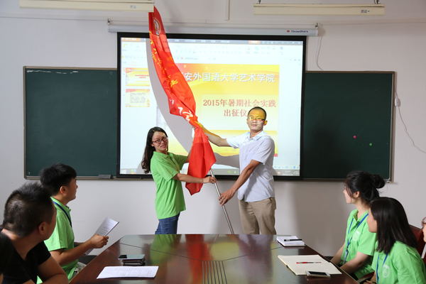 2015年学生暑假社会实践出征仪式在会议室JD332举行。院党委书记马莉老师、团工委书记程成老师、艺路阳光暑期实践服务团带队老师解甜雨老师、2014年带队老师高明老师及艺路阳光暑期社会实践服务团全体队员参加。仪式由带队队长李方德主持。