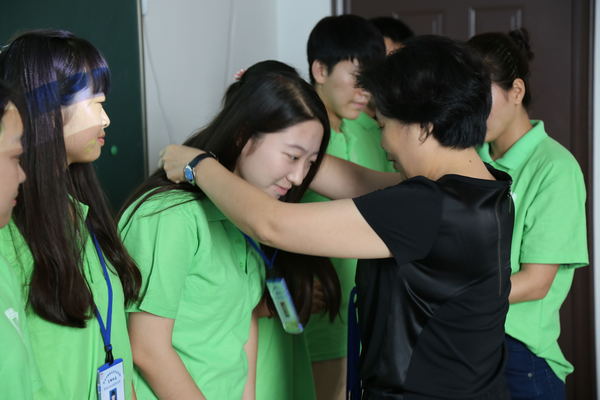 随后,党委书记马莉老师为暑期实践团队员授牌并合影留念,每一个戴在成员身上的队牌不仅仅是一份荣誉,更承载了一份沉甸甸的责任。接下来,新老带队老师进行队旗交接,相信不管时间怎样更迭,乐于奉献、服务他人的志愿精神会在这个优秀的队伍中一直传承下去。学生代表韩萌进行发言,她代表全体队员向领导与老师郑重承诺,在此次活动期间队员们将会发挥吃苦耐劳、团结协作的精神认真实践,圆满完成任务。