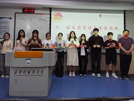 分团委学生副书记石涵喆同学宣读新发展团员名单。随后,各位老师为新发展团员佩戴团徽。由冯鑫带领全体新团员共同面向团旗宣誓,希望新团员们能牢记入团誓词,用行动践行青春誓言。新团员代表杨乐乐同学发言,她表达了加入共青团的喜悦与自豪,并表示将在学习、生活和实践中牢记团员身份,以更高标准严以律己。