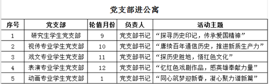 (1)党建引领进公寓:由学院各党支部为主体,将党支部活动融入思政进公寓活动,由各党支部轮值,每月开展一次主题活动或志愿服务,轮流进公寓开展主题活动以及志愿服务等。主题可以参考思政进公寓年度活动计划的主题内容,也可结合文艺党课的实践研学讨论和主题党日活动等进行,也可自行策划,形式可灵活多样。每月活动由轮值的党支部书记负责策划、开展、宣传。各位党员、入党积极分子请及时关注,踊跃参加