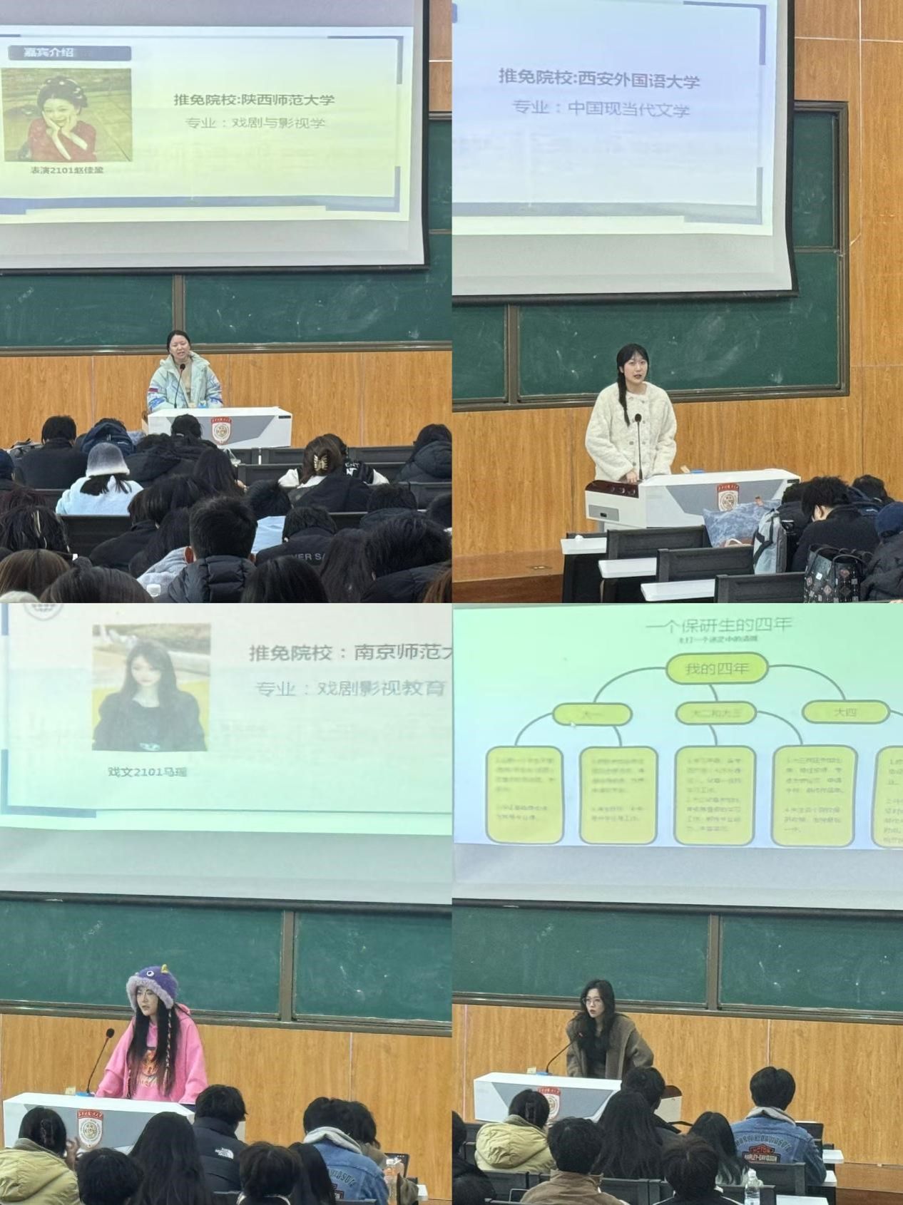 冯鑫对分享嘉宾作介绍,鼓励大家尽早做好大学学业规划,重视班级学风建设,遵守上课、考试纪律,以优良学风促进班集体建设。分享会上,表演专业赵佳莹、视觉传达设计专业罗钰人、动画专业焦雯欣、戏剧影视文学专业马瑶、高昕睿轮流发言分享,她们结合自己的亲身经历,从学习方法、时间管理、课程选择、科研项目参与、社会实践以及推免准备等多个方面进行了详细而深入的介绍分享。她们强调了大学期间自我规划的重要性,建议大一专注软件学习与审美积累,大二深化专业知识学习,大三确定发展方向并参加比赛与实践,大四完善毕业论文与作品集,并鼓励同学们要勇于尝试、敢于挑战,不断拓宽自己的视野和知识面。戏剧影视文学专业张桐雨详细介绍了西部计划研究生支教团的选拔考核情况,介绍了报名条件、笔试面试流程和在校学习心得,让同学们了解了基层项目选拔路径。