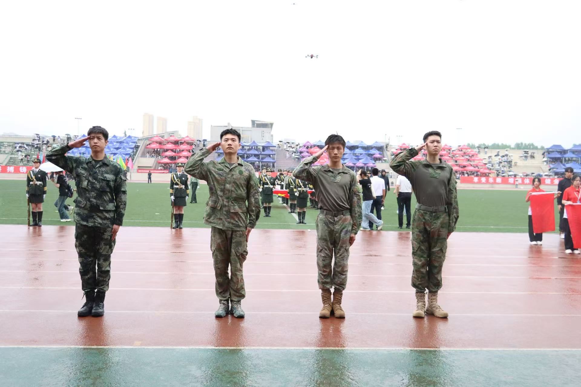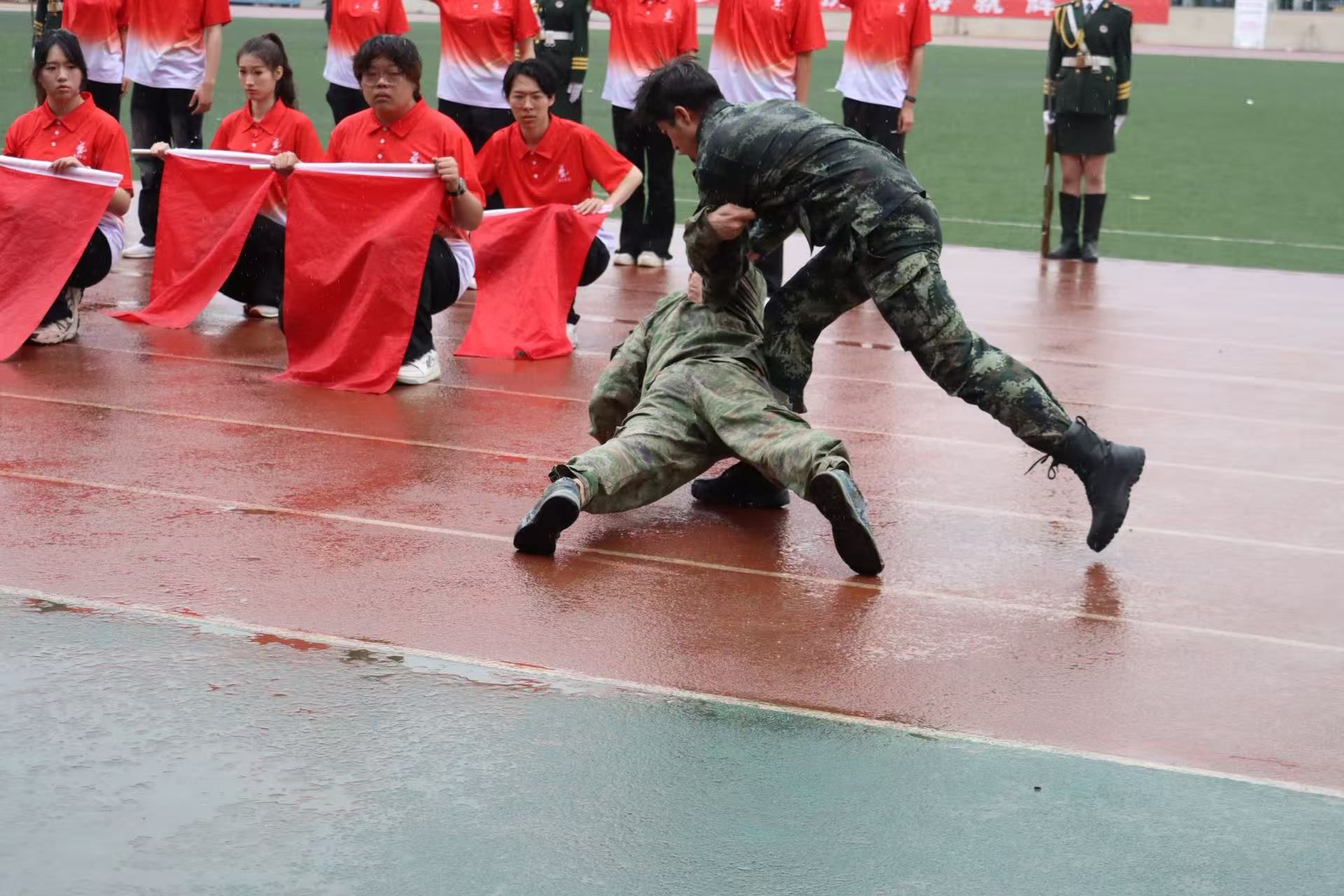 退伍军人方阵迈着铿锵有力的步伐踏上场地。他们身姿挺拔,眼神坚毅,如钢铁铸就。他们重现格斗训练,近身搏斗间尽显男子汉的阳刚之美。每一个动作都精准到位,每一个眼神都透露出保家卫国的决心。他们用行动诠释了 "精忠报国" 的含义,他们是校园中最可爱的人,用青春守护着和平。