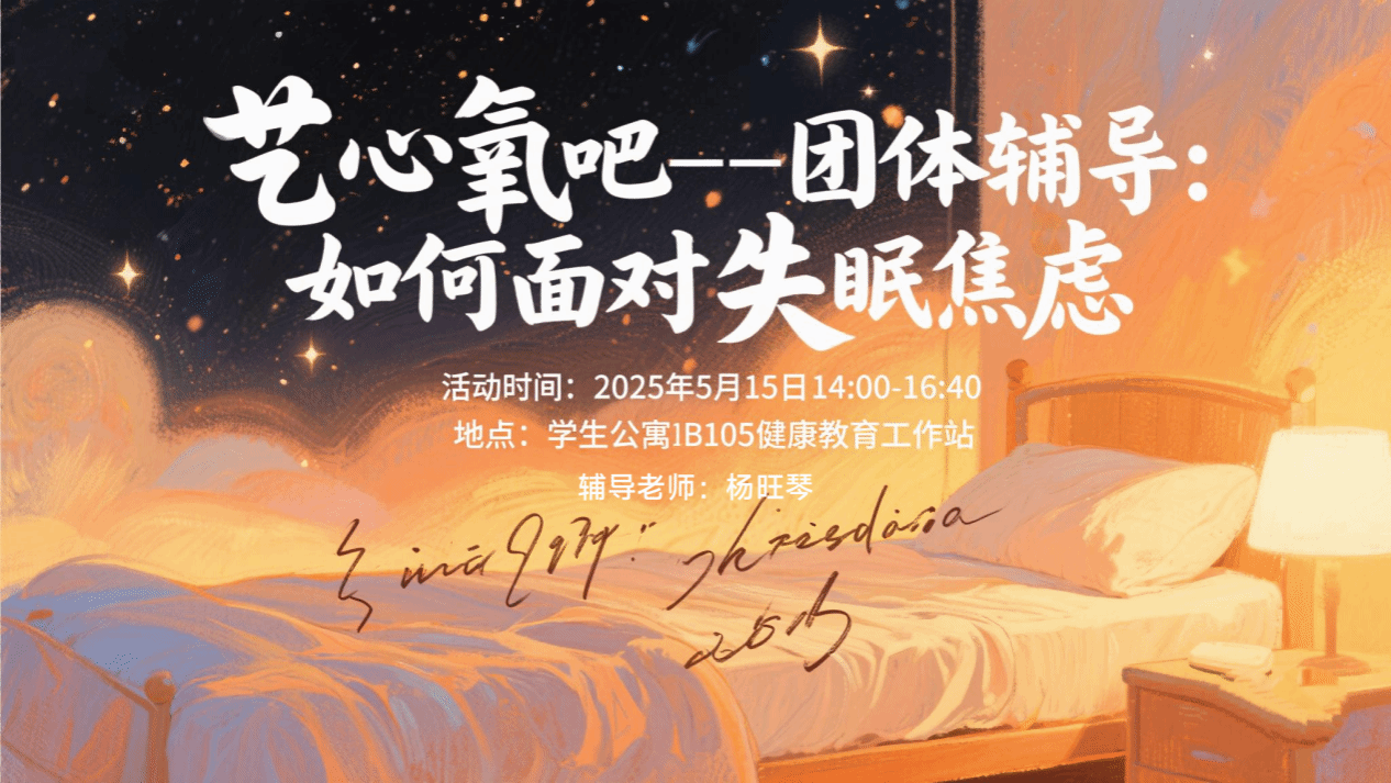 “如何面对失眠焦虑”团体心理辅导活动即将开始,5月15日(周四)14:00—16:40,学生公寓1B105健康教育工作站,欢迎饱受失眠或焦虑困扰的大家来与我们一起点亮安眠之夜,重拾活力晨光。
