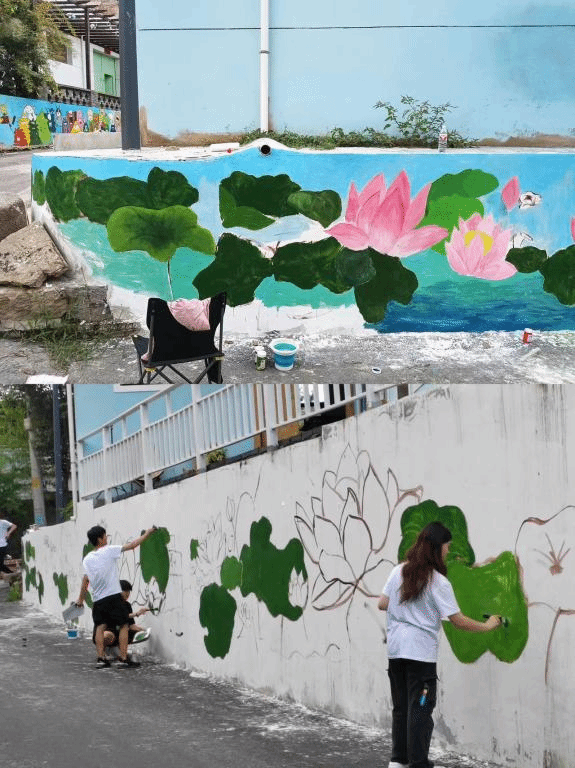色彩自手中画笔而出,斑驳的墙面就绽放出了四季。实践服务团墙绘组成员分工协作,配合默契,依照预期计划完成了墙面绘画内容:盛夏蝉鸣悠长,池塘满眼的绿里亭亭冒出新荷。天气条件恶劣时,队员们通过会议总结,也对其余各墙面进行了绘画内容的统一与商定。队员们用手中的画笔为街区墙面添美增色,同时吸引了当地村民和游客们的驻足观看,对实践服务队员们的工作成果给予了一致好评。