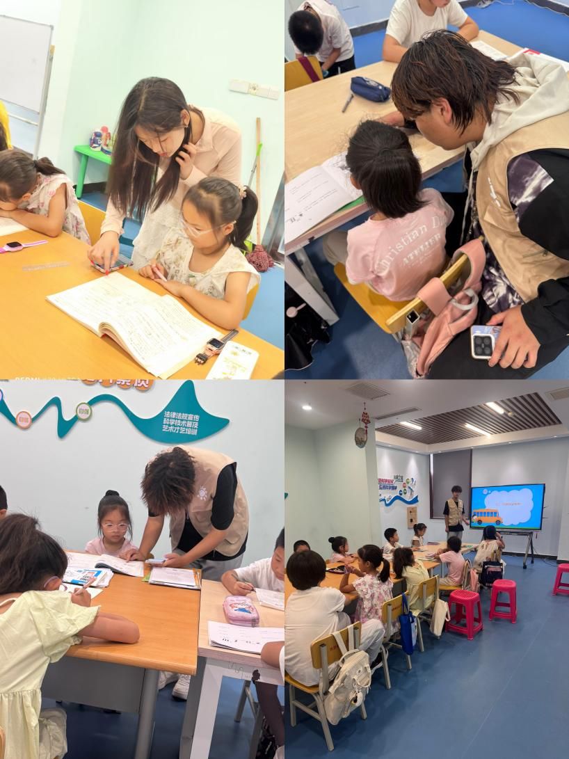 开营仪式上,初见的拘谨在互动中消融。队员们化身耐心导师,陪孩子们在轻松氛围中完成暑假作业,交通安全讲解更如细雨般浸润童心。午后的飞盘绘画课上,队员们俯身指导的身影与孩子们笔下绽放的奇思妙想相映,让艺术的种子悄然萌发。