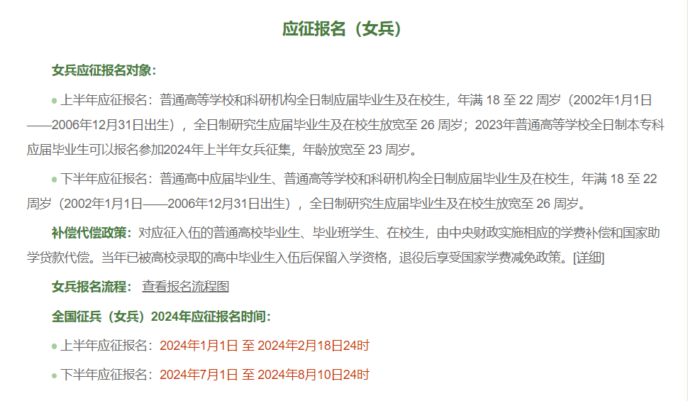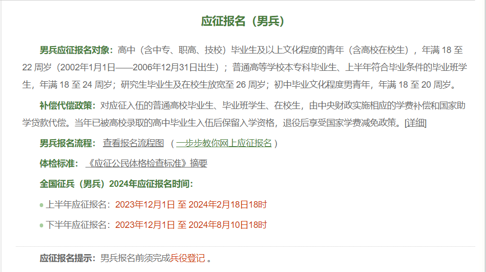 男兵下半年应征报名2023年12月1日至2024年8月10日女兵下半年应征报名2024年7月1日至2024年8月10日