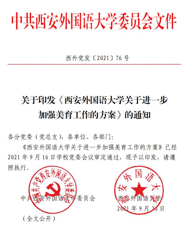 为贯彻落实习近平总书记关于教育的重要论述和全国教育大会精神,根据中共中央办公厅、国务院办公厅《关于全面加强和改进新时代学校美育工作的意见》(中办发〔2020〕36号)、教育部《关于切实加强新时代高等学校美育工作的意见》(教体艺〔2019〕2号)、教育部《全国普通高等学校公共艺术课程指导方案》(教体艺厅〔2006〕3号)等文件要求,进一步强化我校美育育人功能,构建具有西外特色的美育体系,特制定本方案。