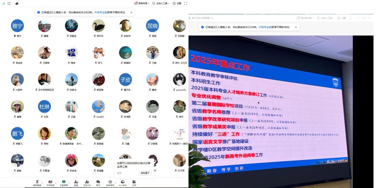 会上,副院长徐雅宁对学校2024-2025学年第二学期本科教学工作会议的要点进行了传达。他围绕本科教育教学审核评估、本科招生工作、2025版本科专业人才培养方案修订工作以及专业优化调整等方面,对学校的工作计划和政策要求进行了细致阐述。徐雅宁强调,全体教师务必高度重视即将开展的教学大检查,秉持严谨态度对待教学工作,切实保障教学质量,助力学校在本科教学工作审核评估中取得优异成绩。针对本年度招生工作面临的严峻形势,他鼓励大家集思广益,拓展多方资源,为学校招生积极贡献力量。同时,为契合学校未来发展需求,新修订的人才培养方案需充分体现OBE理念、专业加外语模式以及AI赋能等新趋势。各专业教师要主动采取有效措施,积极应对专业优化调整带来的挑战。