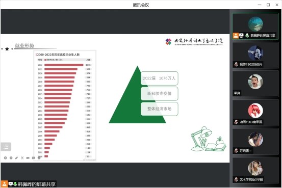 会议开始讲解了每届毕业人数上升,新冠对就业形势的影响,整体经济市场环境的影响,以及毕业之后的去向和多种选择。对同学们可能存在的问题进行了罗列总结。对就业的同学进行的建议和找工作实习的注意事项进行详细分析,对考研的同学进行了形势的分析、往届考研的经验案例分享、考研院校的选择注意事项。让同学们自己做分析和面临的选择,让同学们有多种准备应对当前形势的改变。