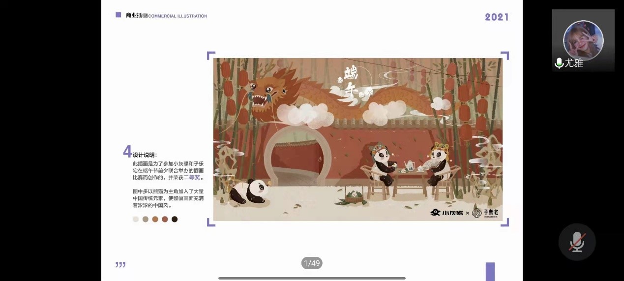 视觉传达设计专业,硕士学位就读于韩国弘益大学视觉传达设计专业,擅长视觉与插画设计方向,尤雅同学从自己的设计作品介绍了她的学习经历和感受出发,并分享了自己在韩国留学的经历,与同学们在设计思维模式的建立、设计能力的提升以及出国留学等方面进行了较为深入的沟通,并对同学们对出国留学的问题进行了解答。