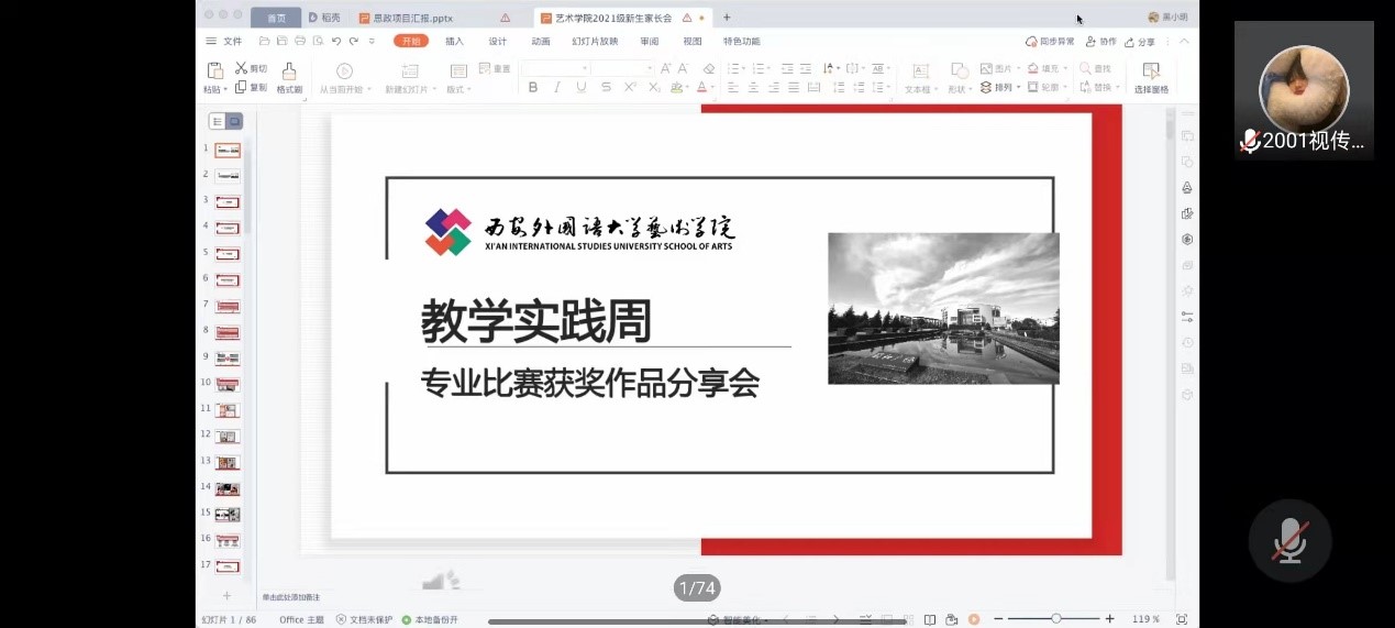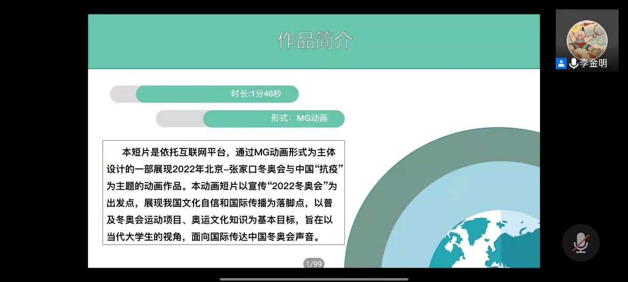 李金明老师展示了接下来获奖同学的作品,之后由获奖同学2019级动画专业马萨、董何锦春、杨依璇、张炳权和2019级戏文专业的赵佳智分享作品获奖心得体会和参赛经验,之后由王元方老师进行总结。
