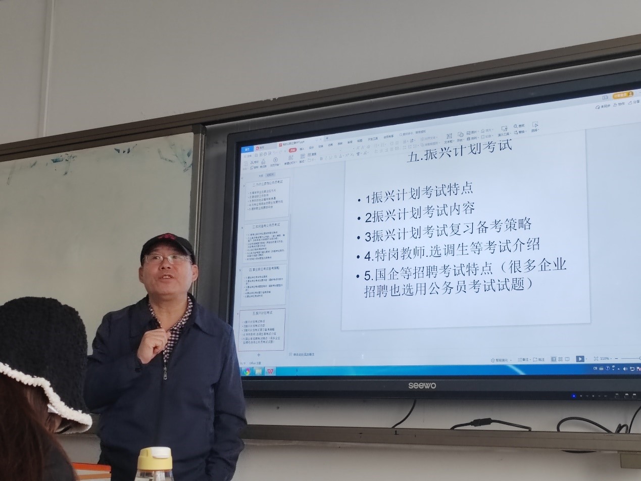 “公职类考试备考讲座”在JE501举行,本次讲座由戏剧影视文学教研室张勤宝老师主讲。