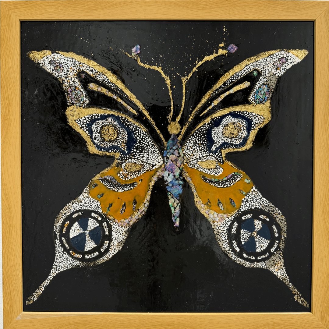 作品《蝶》 用蛋壳及螺钿表现蝴蝶的翅膀和身体,营造蝴蝶煽动翅膀时翅膀的灵动。