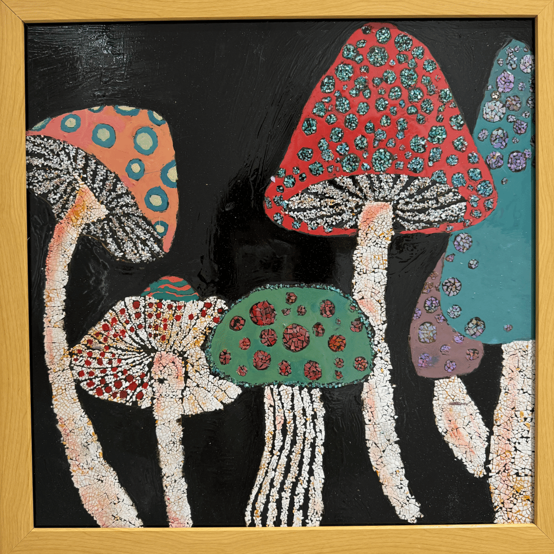 《蘑菇》采用了传统漆画的镶嵌的技法。蘑菇的伞盖部分match漆平涂使其呈现出相对艳丽的色彩;而蘑菇的茎部使用了镶嵌蛋壳的方法体现出了蘑菇根茎饱满的特质。