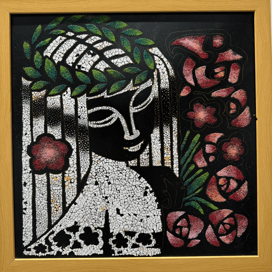 作品《春日少女》将春日生机与少女纯真相融。画面绿叶、繁花围绕着白裙少女,花瓣轻舞。技法上,蛋壳镶嵌少女,黑色作背景,漆粉绘制花朵和绿叶。色彩明快清新,构图疏密有致,少女与景相互呼应。此画是对春日和青春的礼赞,愿观者能从中感受美好,收获内心的宁静与喜悦。