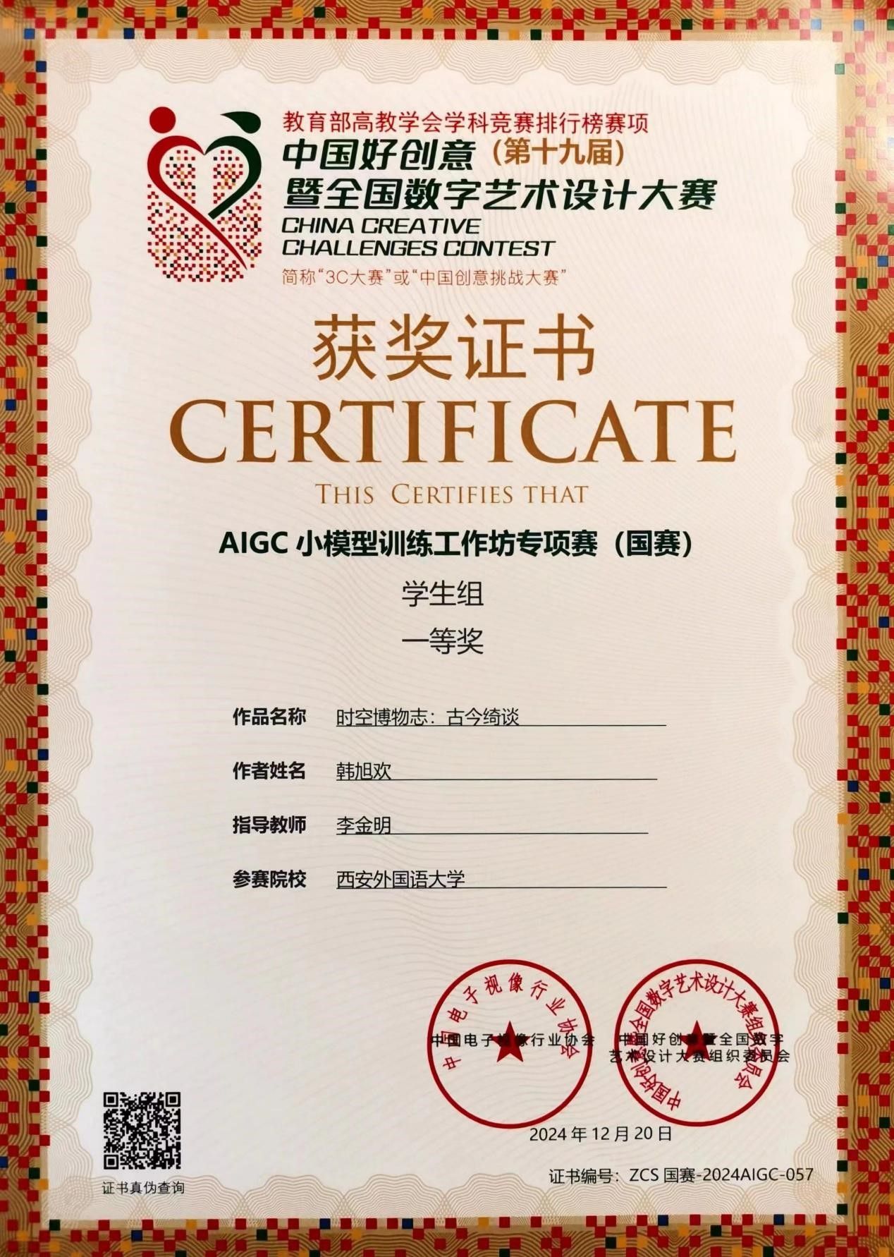 李金明老师指导的2024级研究生韩旭欢同学作品《时空博物志:古今绮谈》在教育部高等教育学会学科竞赛排行榜赛项——中国好创意暨全国数字艺术设计大赛AIGC小模型训练工作坊专项赛中获得国家级一等奖。