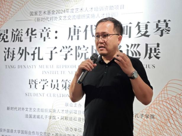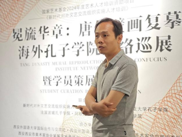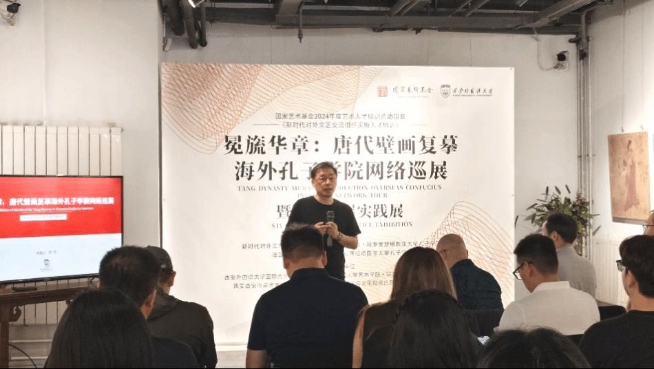 项目负责人李杰教授在致辞中向西安锦业美术馆对项目的支持表示感谢,并对“唐代壁画复摹海外孔子学院网络巡展暨学员策展实践展”的背景做了介绍。他强调,展览策划是由众多细节拼凑起的、多因素互动的复杂过程,要找准关键点,在明确主题的基础上将各项工作贯穿策展实践始终。接着,李杰教授就展览的海外实施相关事项向学员作出详细说明,他指出,海外策展实践是一项系统工程,包含实践、教学、研究等具体工作细则,肩负着传播中华文化的神圣使命,策展人要坚定文化自信,保持高度专注,扎实做好前期准备。要制定流程细化、易于操作的专业化巡展规划,探索在地文化融合路径,着眼于规划的长远覆盖性和延伸辐射功能;要精心筛选展览对象,从其社会影响力、研究热度、时期代表性等多元角度出发,结合后期预设效果,做好展品资源梳理与资料收集等工作;要深入了解展览对象的性质、特点,以此为抓手设定有针对性的展览动线;要保持与相关文博单位、科研院所的沟通交流,审慎选择合作机构,以期实现技术手段与预期规划并行、艺术审美与工艺技巧同向的良好效应;要开阔国际视野,提高海外联络度,充分利用院校的海外教育资源,聚焦国际文化传播需求,精准对接海外文化传播规范,实现文化的跨国在地有效推广;要注重展览展示的社区互动度,在以我为主的同时关注观者感受,注意收集观感反馈。